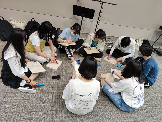 今回は岡本先生によるテコンドーワークショップを行いました。最初は準備体操や、ハンドミットを蹴るなどの基本動作を教えていただき、その後に教えていただいた技を使って板割りをしました。ただ、板を割るのではなく、自分の改善したい部分を板に書いて打破できるようにという願いを込めて割っていきました。各々が自分について直したい部分を思い浮かべて、シンプルな文字だけの板や、イラストを入れて可愛く仕上げる人もおり、和気あいあいとしたアクティビティーとなりました。